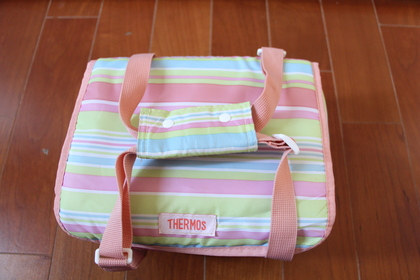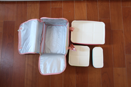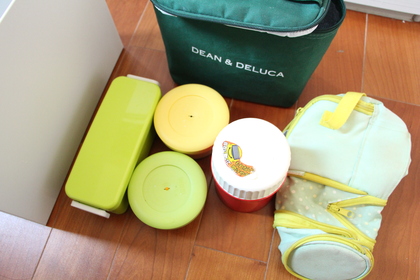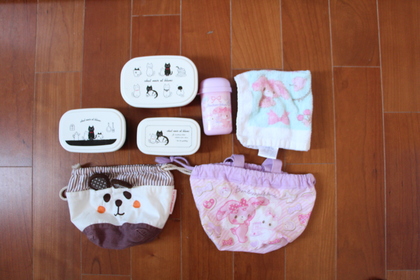 2.娘のお弁当箱、おしぼりセット、お弁当袋(保温機能つきと、普通の布の袋2種)