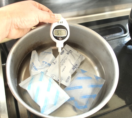 保冷剤をパックごと60度のお湯につけて5分ほどで、