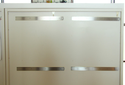100均ステンレス物差しを両面テープで貼り付けた掲示板。