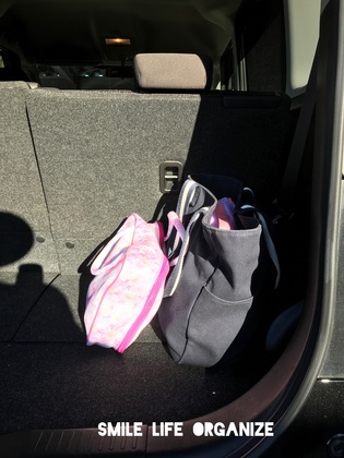 ジムで使うウエア、シューズ、タオルはいつも車に乗せています。ウエアは2セット用意して、写真のようなメッシュのバックに1セットずつ入れています。
